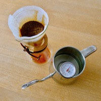 岡本さんの仰るとおり、一服するタイムはだいじです。ケメックスはボクの好み、ポットと温度計はカフェ・ヴィヴモン・ディモンシュの堀内さんと同じ道具で気どる。これが朝一番のルーティーン、おまじないです!
