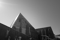 地球の巨匠丹下健三さま設計、まことに厄介な造形をした日南市文化センターでございます。台形の平面空間が重なり合って、内部空間が外部に飛び出す暴力的な造形。中のホールを見学させていただきましたが、舞台に向かってスボまる平面は観劇に集中させるであろう見事な設計。座席はしっかりと勾配がつけられ、後方からの眺めがバッチリ、基本のキをおさえる巨匠、サスガです。